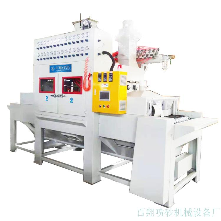 这款自动喷砂机相当于两台12枪的自动喷砂机,但占地面积比两台自动喷砂机小,同时大大的改善了产品变形严重的问题。而且操作场地与操作人员比两台自动喷砂机减少了50%,操作无需聘请技术型人员,由工人将产品从一端放在输送带上,先将产品一面喷砂处理,当产品输送到另一端时,工人将产品翻面喷再喷砂,产品再由输送入品端输出,人工取下工件。
