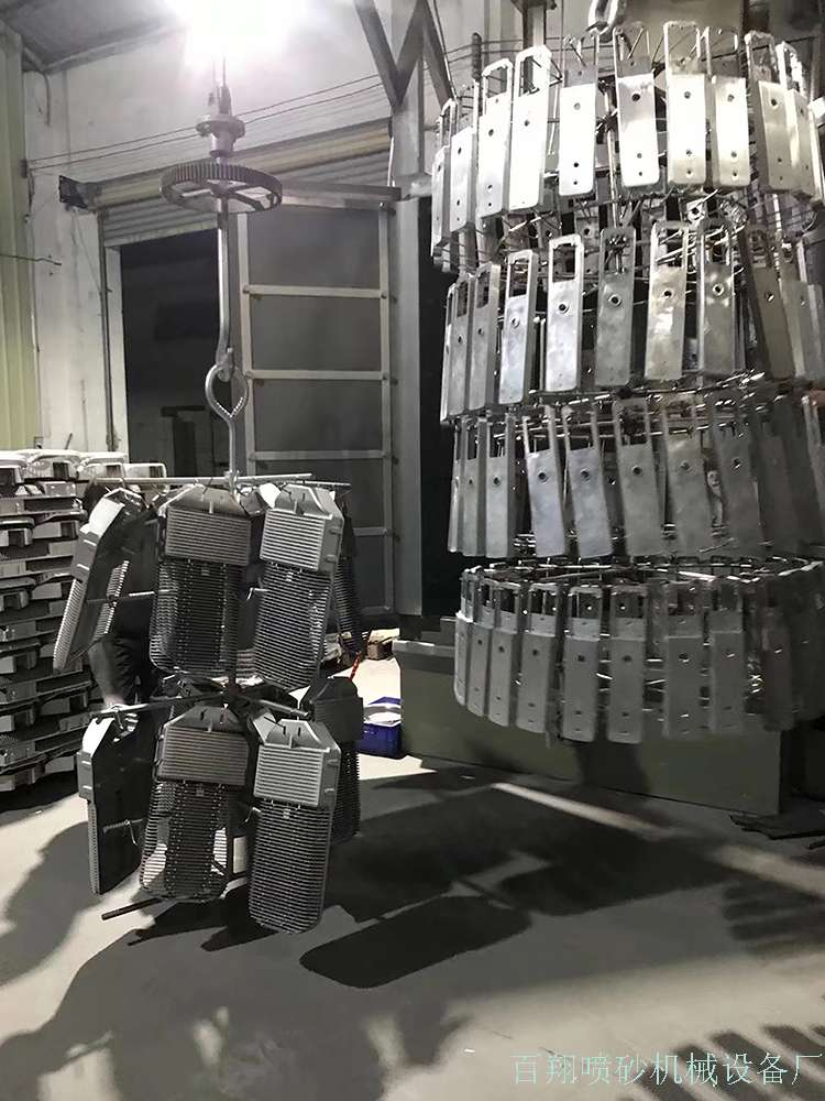 吊钩抛丸清理机为悬挂式抛丸清理设备,又被称为吊钩抛丸机,他由抛丸清理室、弹丸循环系统、轨道、吊钩、自转机构、除尘系统等部分组成。