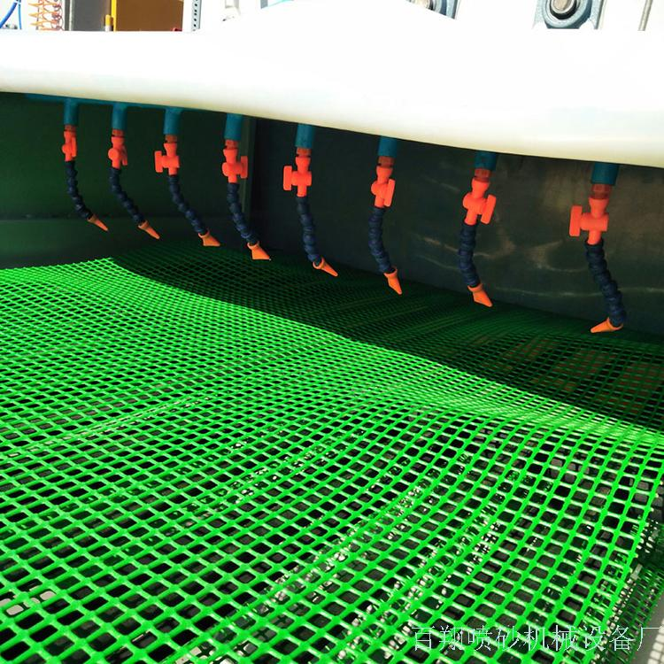 1,本设备采用包胶滚轴+三角皮带,皮带间距要在60-50mm之间,输送工件,组成输送机构,不会积砂,加工产品时,只需将待加工产品放置在输送带上即可(速度可调),当产品通过主机舱后,产品完成喷砂。