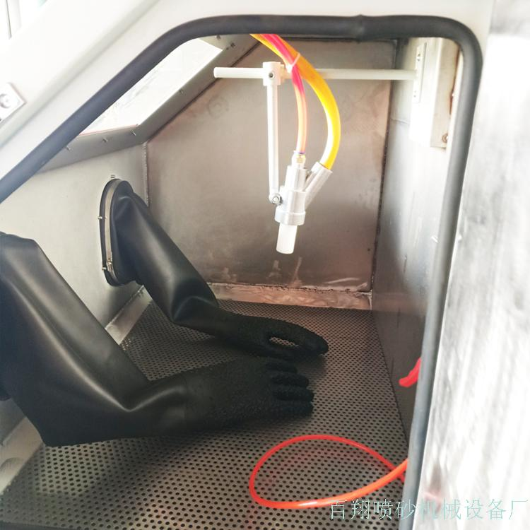 百翔手动喷砂机是一种箱式喷砂机,这种是封闭式的干喷砂机,喷砂加工时没有粉尘外扬,机器自带除尘箱与二级分离器,适合使用各种粗细砂料,喷砂舱内配有固定喷头的枪架,完全解放双手,这样能更好的掌控喷砂的品质与速度。机器控制面板上有调压阀,可以用来调置喷砂的压力,百翔机器另外多配了一把吹净枪,方便清洁产品与机器。