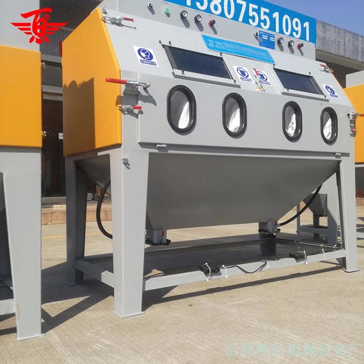 双工位手动喷砂机,这是用户定制的一种非标准规格喷砂机,因为客人需要加工的产品比较长,用单工位的手动喷砂机加工时产品,即使喷砂舱能将产品放进加工舱工,喷砂时也没办法将整个工件喷到,所以在设计机器时多加了一个工件,用来增加喷砂的有效长度。这款喷砂机配备的是独立的除尘箱,除尘方式采用的是脉冲滤芯除尘。喷砂启动开关用的是脚踏开关,这样方便使用者把握喷砂的效果。